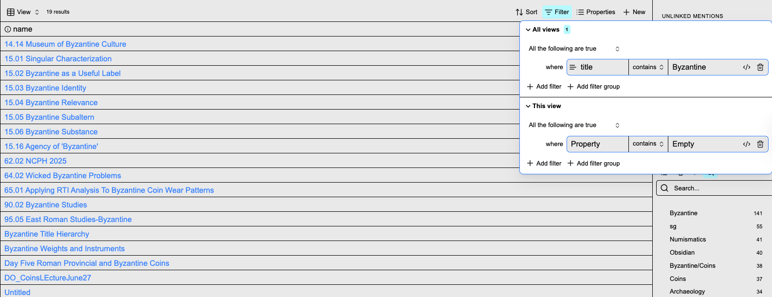 Why, you may ask? Briefly, I put tags in the main body of each note. This allows effective navigation of my Open-Access Notebook (OAN). I do not include tags in my properties or front matter because I do not want to double-count them. For example, if I put the tag #Byzantine in the body of my text and properties, it counts as two tags, not the note being tagged once with #Byzantine. It seems trivial, but in my vault sidebar, where I have all my tags listed, I want the tags to correspond with the number of notes — if that makes sense. Obsidian also plans to integrate the plugin into Obsidian Publish, which I assume would allow people online to create databases from, for example, my OAN, potentially leading to misrepresentation of the number of notes created associated with the tag. Again, this is speculative but for my project is a bit of a concern moving forward.